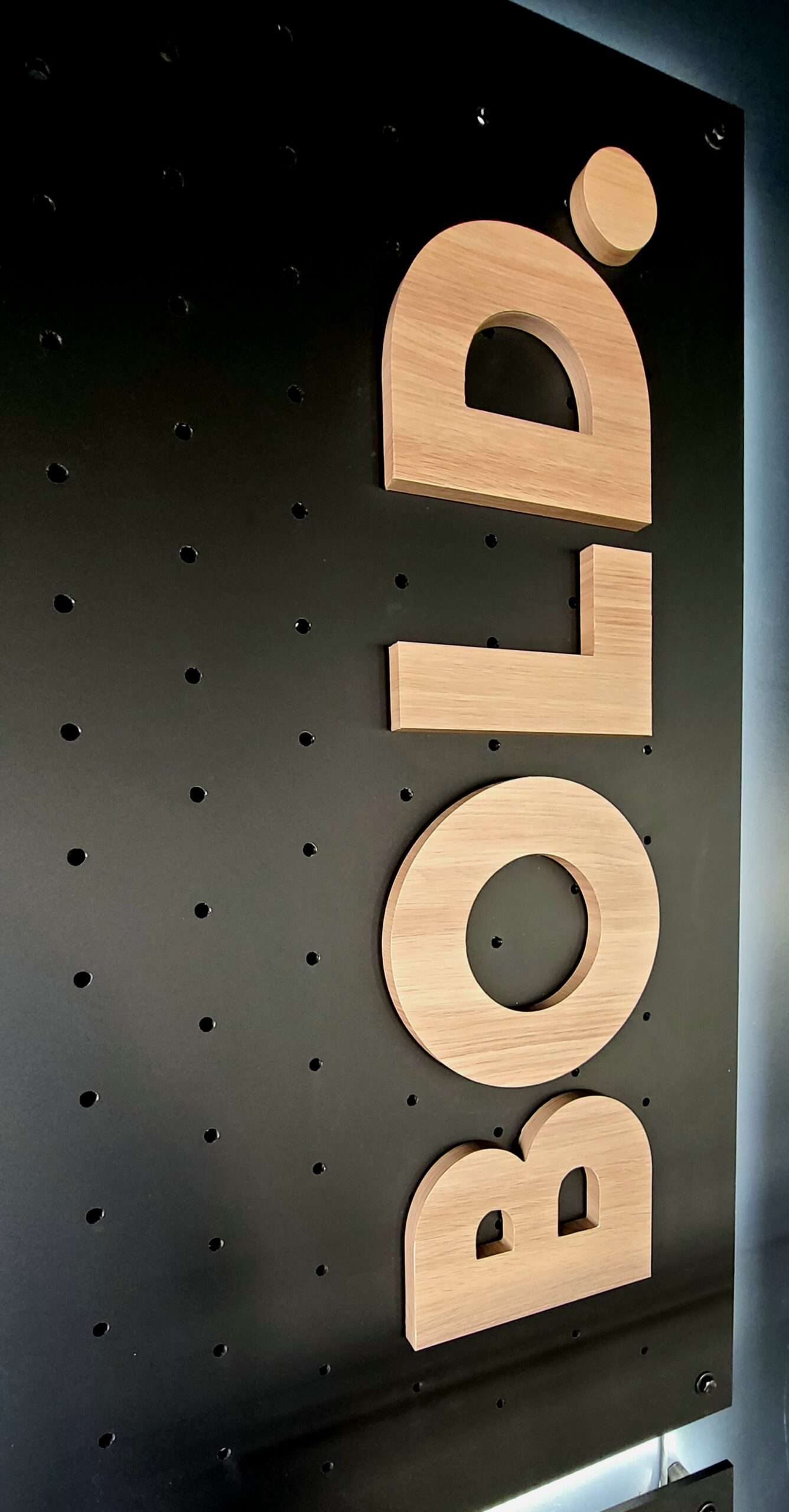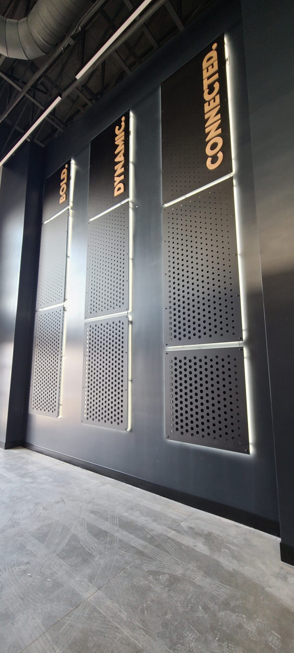 Scaling up, the installation reaches new heights—literally. On a 30-foot wall, we engineered and installed oversized halo-lit panels, each CNC-cut with intricate hole patterns. The result is a dramatic interplay of light, shadow, and depth that transforms the wall into an architectural centerpiece.