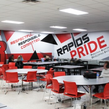 Branded environments create a visual immersive experience that communicates vision, mission, and history. Environments that incorporate stunning visuals and messaging like “Rapids Pride” help build culture, attract and retain students and staff, and encourage engagement and fun! From design, to project management, production, and installation, our awesome team worked together to create incredible impact at this project.